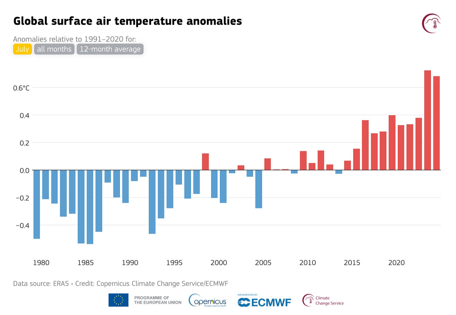 Last month was the second-hottest July on record, ending a streak of 13 consecutive months that set new global heat records. According to Copernicus, the EU climate change service, the average surface air temperature in July was 16.91°C, which is 0.68°C above the 1991-2020 average. It was surpassed only by July of last year as the hottest July on record, and even then by a mere 0.04°C.