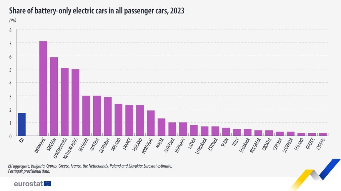 The EV revolution is growing across the European Union, and Denmark is leading the way. Last year, 1.7% of all cars in the EU were electric, according to the statistics agency EuroStat. Denmark (7.1%) and Sweden (5.9%) had the highest proportion of electric vehicles of any country in the EU. Cyprus, Greece, and Poland had the lowest (each at 0.2%).
