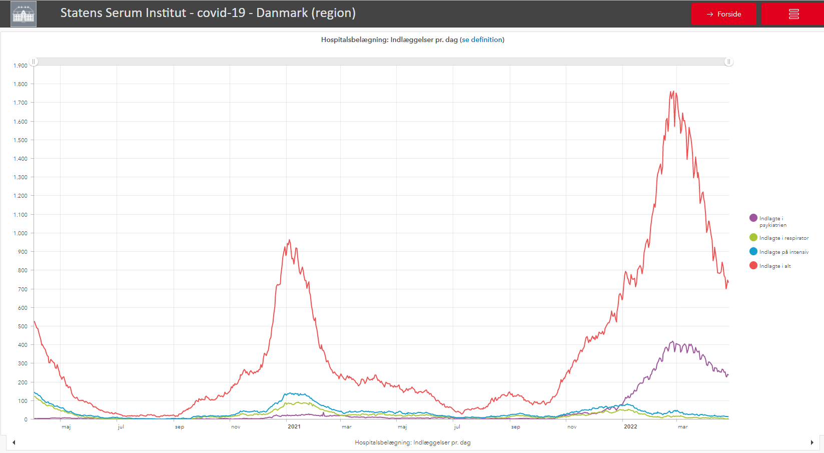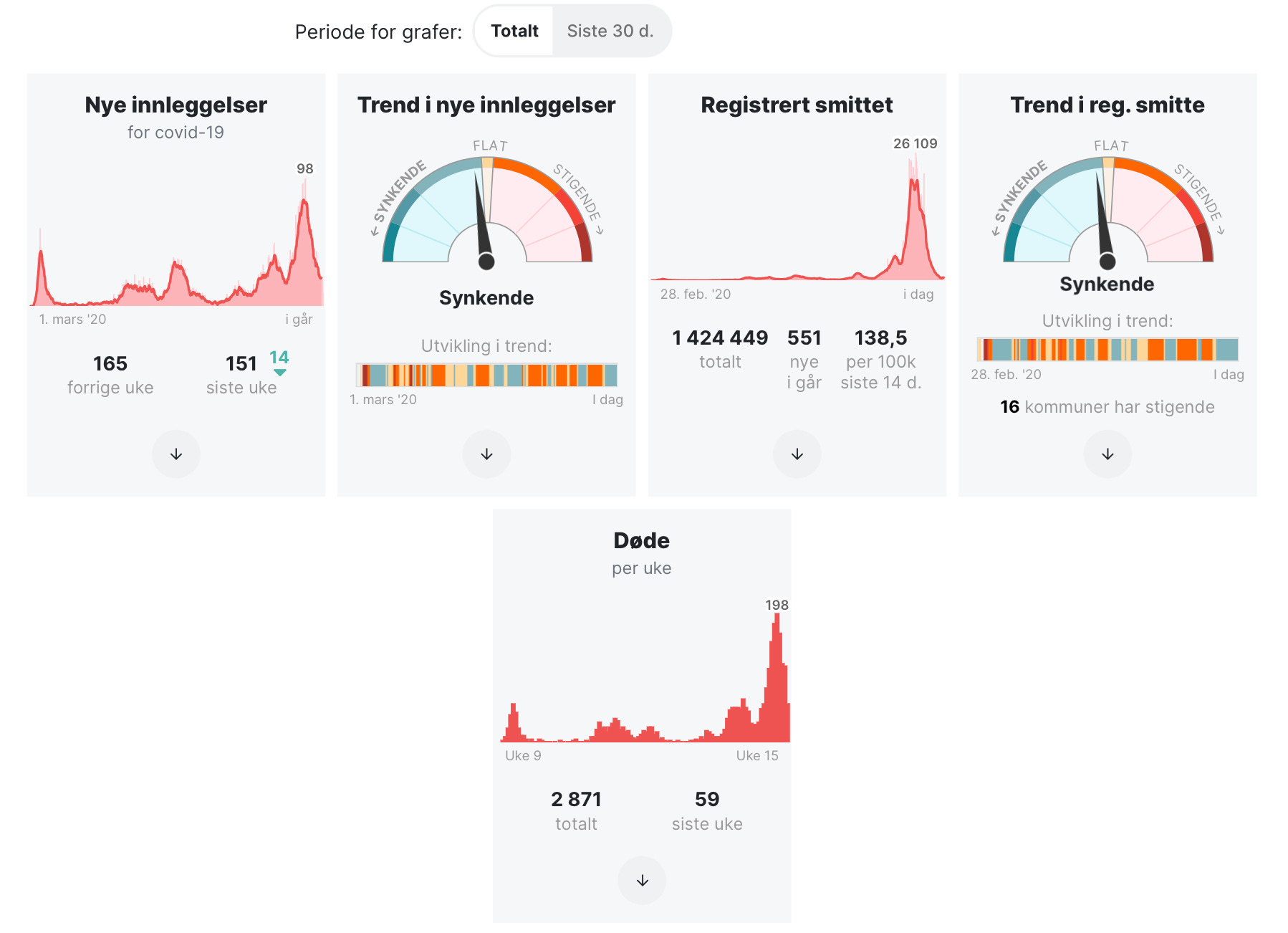 The Norwegian Institute for Public Health no longer reports hospitalization data other than weekly admissions. Over the last seven days there were 151 corona cases admitted, which is 14 fewer than the week before.