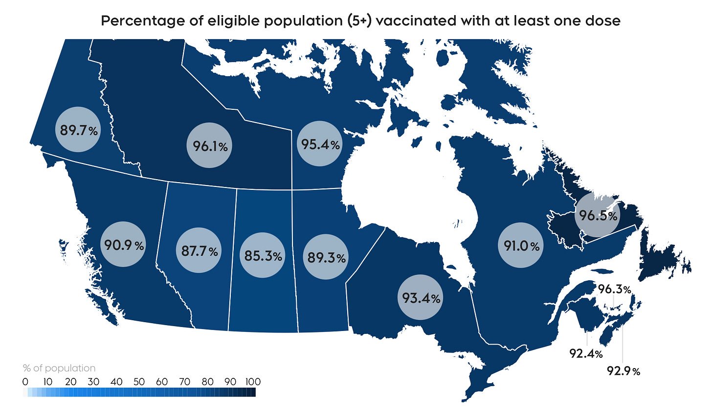 The Canadian vaccination effort has so far administered 32,785,683 1st vaccine doses (85.75% of the total population) while 31,250,247 people (81.73%) have two doses, and of those, 18,375,417 people are fully vaccinated with three doses.