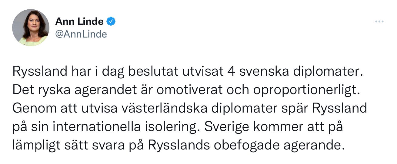 “Russia’s action are unjustified and disproportionate. By expelling Western diplomats, Russia is contributing to its international isolation. Sweden will respond appropriately to Russia's unwarranted actions.”