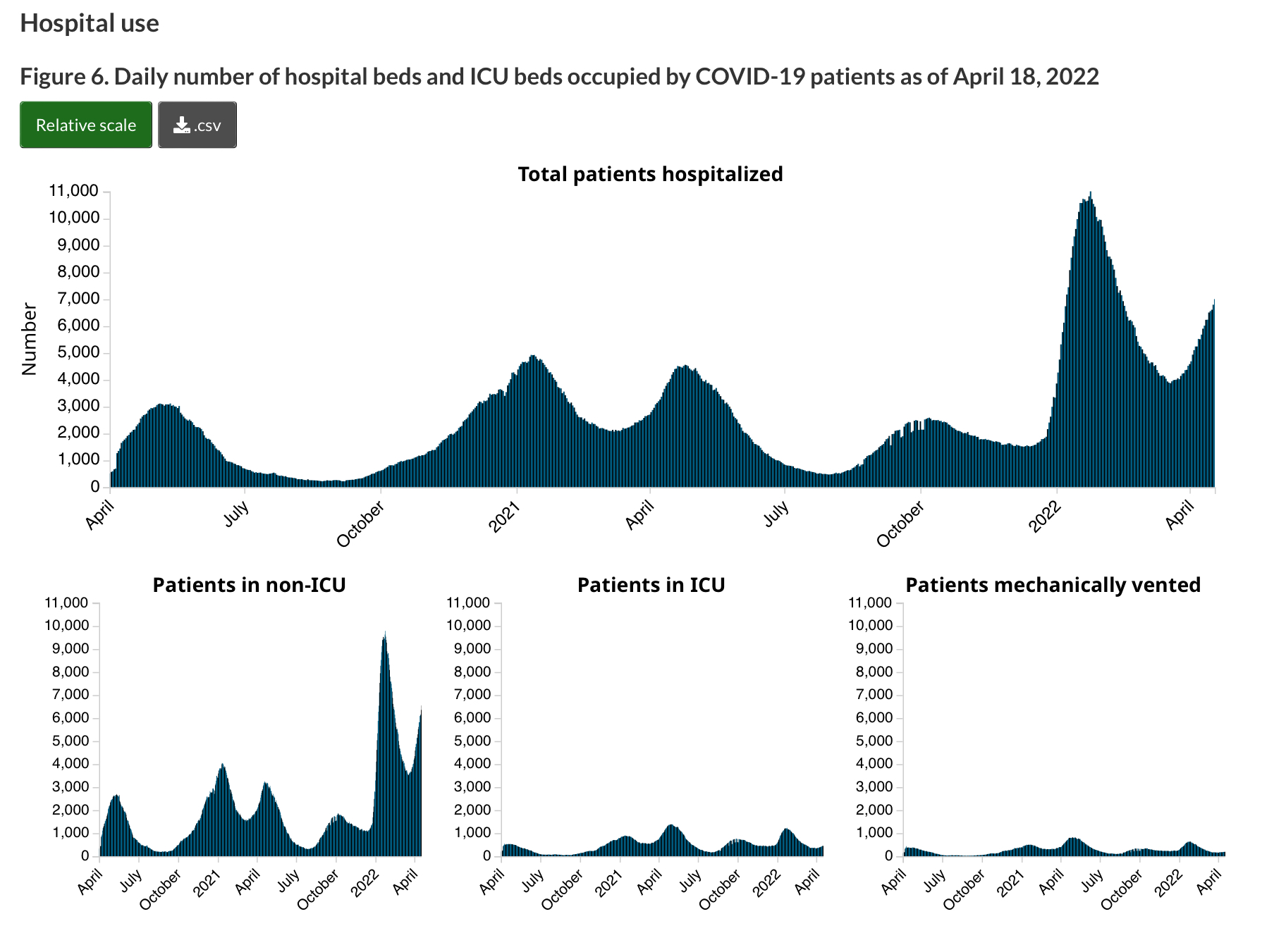Breaking it down to general COVID admissions, the number of hospitalized pandemic patients rose from 5,619 to 6,550 that week. While intensive care numbers increased by 57 to 458 total beds in use, of those, the number on a ventilator also increased, going from 173 to 194.