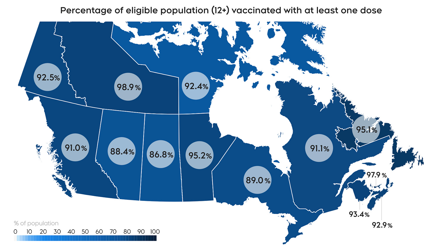 The vaccination effort in Canada has so far administered 30,079,474 1st vaccine doses (78.67% of the total population) while 28,876,081 people (75.52%) are fully vaccinated. So far, 779,159 booster doses have been administered.