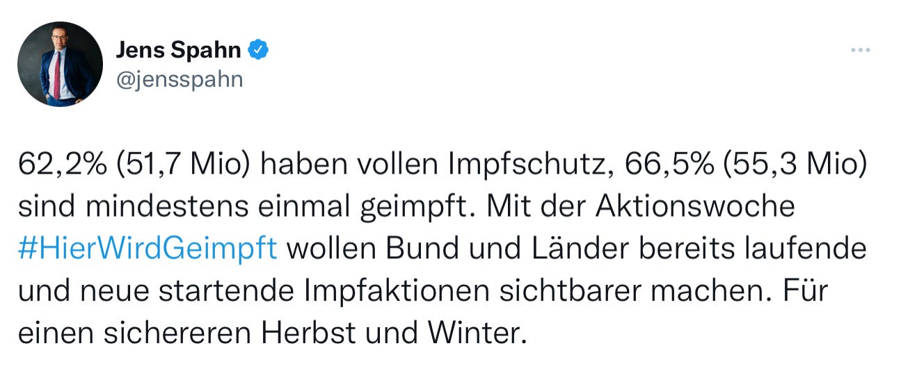 A week-long nationwide vaccination campaign begins today in Germany. Health Minister Jens Spahn, who has been warning inoculation rates are far too low, says the numbers must increase “for a safe autumn and winter.” On top of all the usual places one can get vaccinated in Germany, this week will see pop-up vaccination opportunities in mosques, libraries, shopping centers, and even train stations.