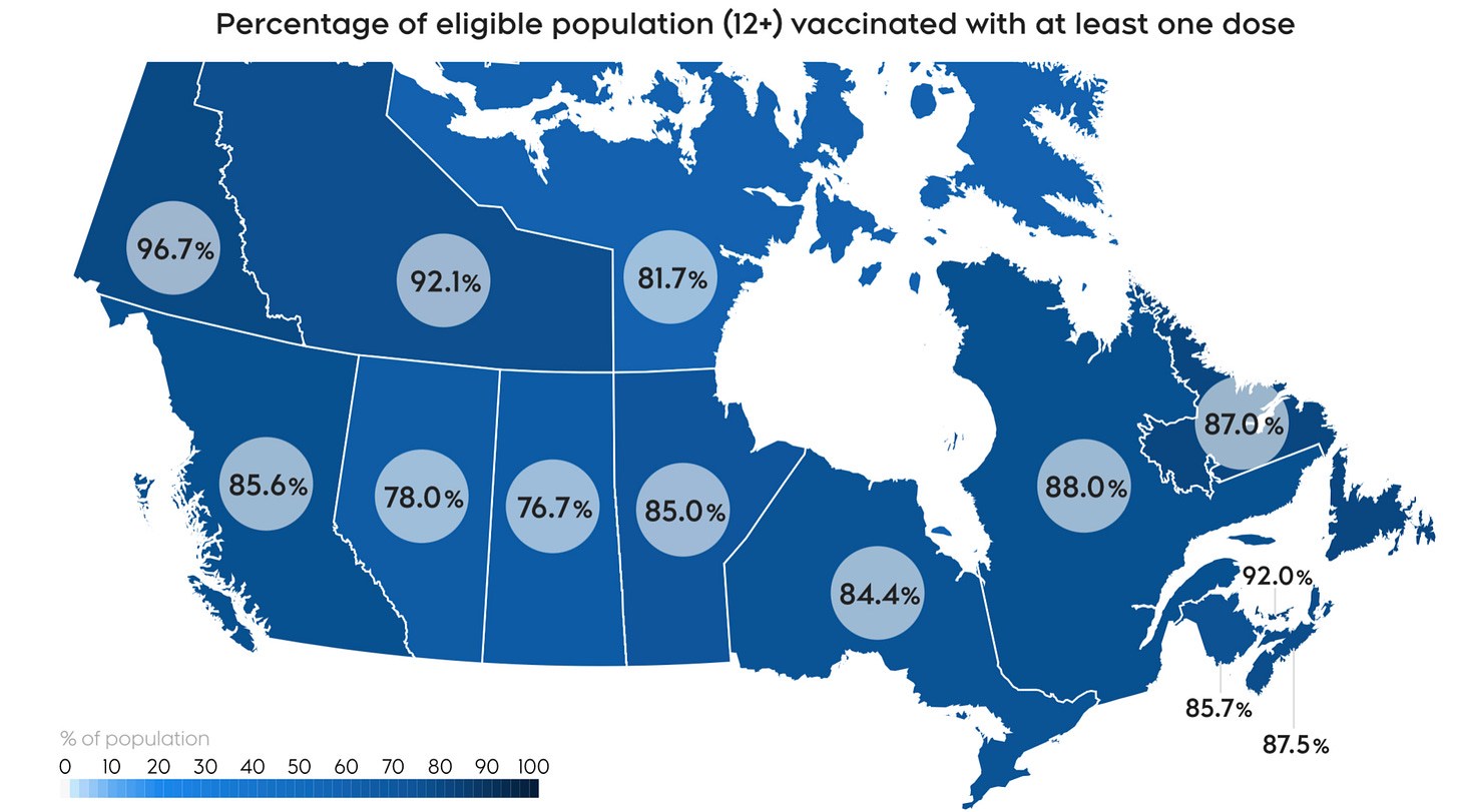 In Ontario today there were 600 new infections, of which 475 were people who were either not vaccinated or had just a single dose. Due to a technical error hospitalizations aren’t available, but the number of people in an ICU is, 189. In Ontario, 84.4% of the population has one dose and 78.1% are fully vaccinated.