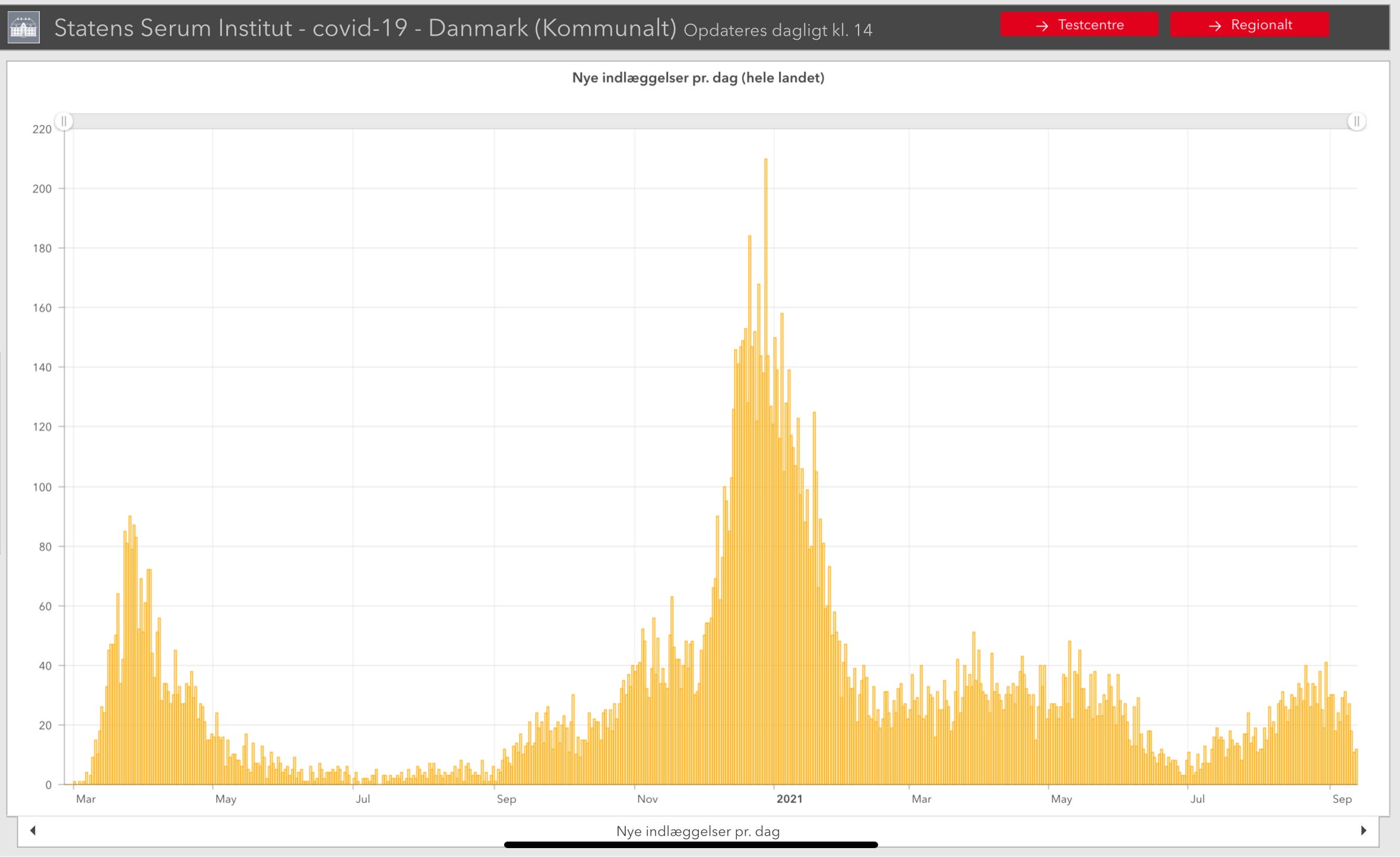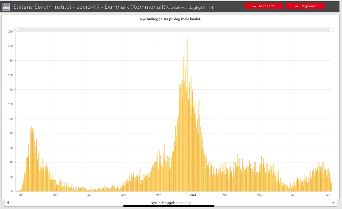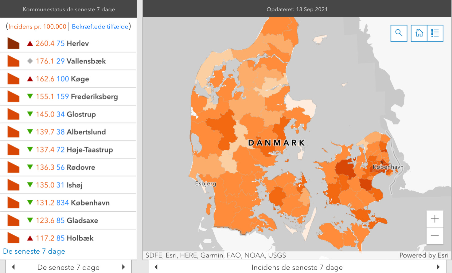 The infection situation at the kommune level continues to improve. There are now just 15 kommunes with COVID incidence rates exceeding 100 for every 100,000 residents. Of those, a single Kommune, Herlev, is seeing a COVID incidence rate over 200.